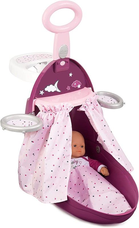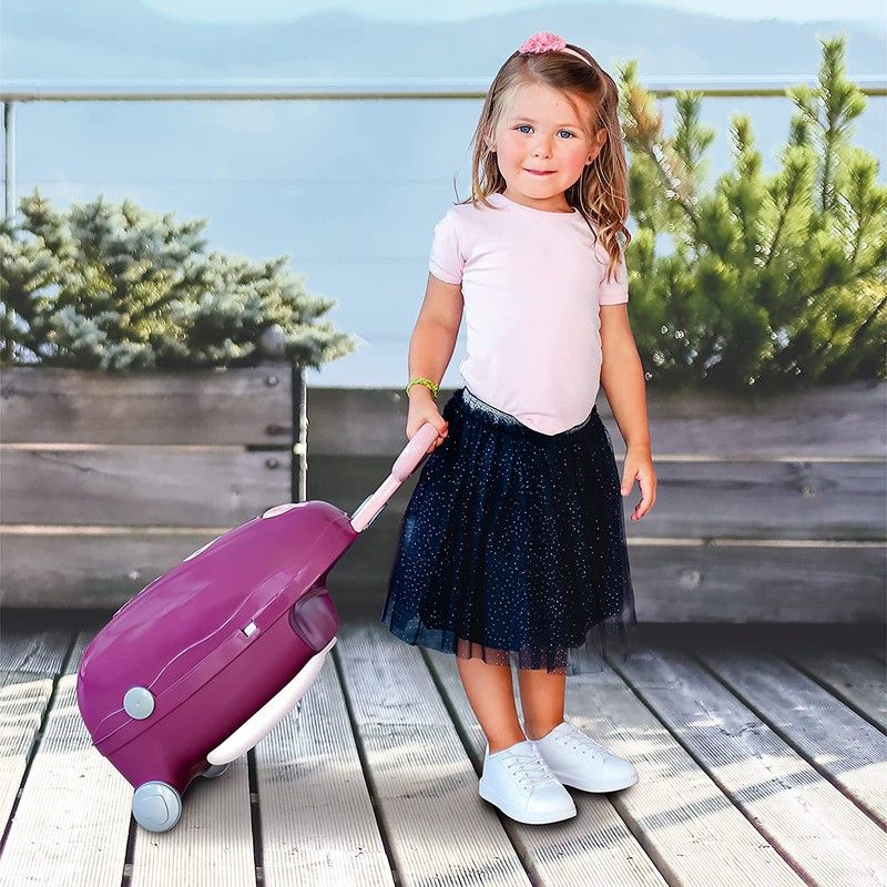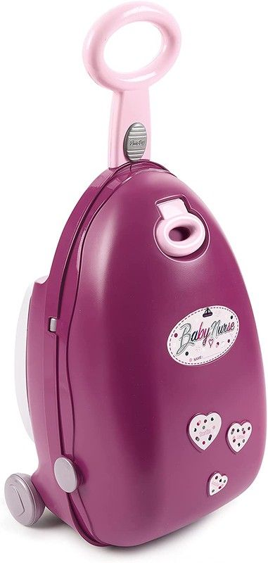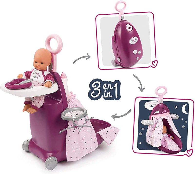 Valise Trolley, quand ouvert 2 aires de jeux, une chambre et une salle à manger avec une chaise haute apparaissent.