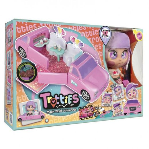 Emma de 25 cm le gusta sobre todo Nueva York. Es una muñeca muy cosmopolita a la que le encantan los deportes y la comida, especialmente probar todos los platos típicos de cada zona. Su increíble súper poder es teletransportarse a sí misma, a sus mejores amigas o a lo que quiera a cualquier lugar del mundo. También puede correr súper rápido y subir a los tejados con facilidad gracias a su súper salto. Vestida con un traje veraniego, que incluye una camiseta blanca muy al estilo de Nueva York, una gorra púrpura, un pantalón corto púrpura deportivo y unas modernas zapatillas azules. La limusina Trottie de 44 cm de largo es el medio de transporte perfecto para celebrar fiestas súper divertidas. Es rápida, glamurosa y tiene decooración glow in the dark en su interior. Esta limusina tiene todo lo que las Trotties necesitan para la fiesta. Hasta 2 Trotties pueden entrar por las puertas y la alfombra rosa que se desliza desde el suelo. Incluye un código para desbloquear más contenidos de Realidad Aumentada.